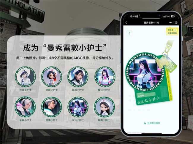 进入由曼秀雷敦打造的虚拟社区中,用用户通过面容识别技术,一键生成专属的AIGC小护士头像,化身“曼秀雷敦小护士”, 在虚拟世界中展现自我个性,实现从体验到身份的升维延展;