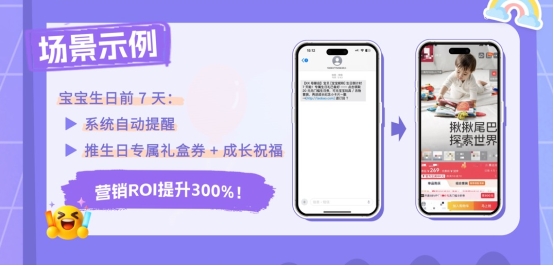 双 12 期间,该品牌针对不同阶段宝宝推出专属套餐:辅食期推送 “营养辅食 + 工具套装”,学步期定制 “学步鞋 + 防摔护具 + 益智玩具” 套餐,叠加 “新客入会 8 折 + 生日专属礼” 福利。”阶段化精准触达“替代盲目群发,新客入会率提升 50%,客单价上涨 22%,营销 ROI 提升 300%。宝宝生日前 7 天,系统自动推送礼盒券与成长祝福,进一步增强用户粘性。