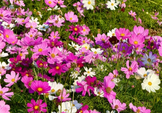 穿过地铁6号线“科学公园”站的出口,步行几分钟,一片粉紫交织的花海便映入眼帘。成千上万的格桑花在冬日暖阳下摇曳生姿,粉的娇嫩,白的纯洁,紫的神秘,构成了一片色彩斑斓的海洋。这片花海没有刻意修剪的痕迹,花朵肆意生长,高低错落,透着一股自然野趣的生机。