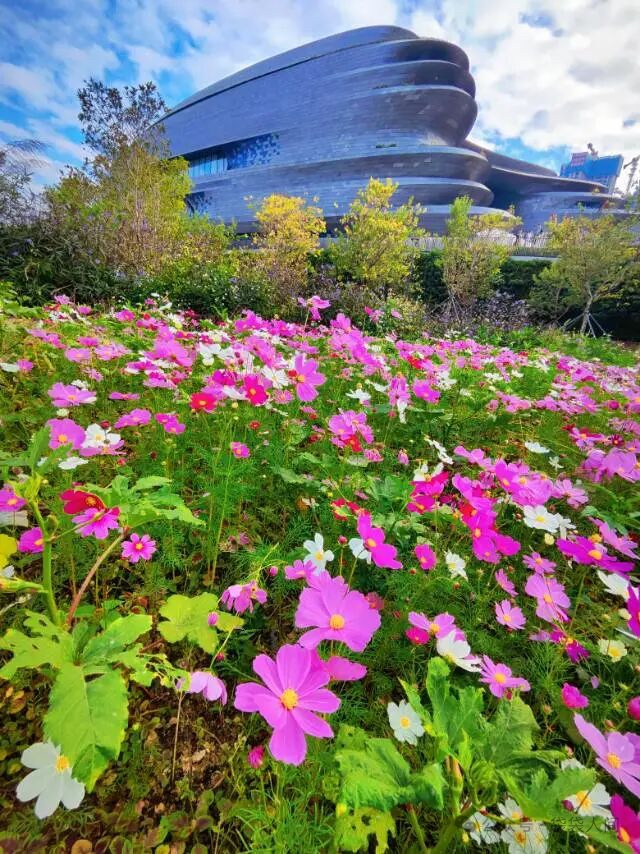 这片格桑花海最独特的魅力在于它与城市建筑的同框。抬头望去,深圳科学技术馆那流线型的银色建筑在阳光下熠熠生辉,宛如一艘即将起航的宇宙飞船,与前景中柔软的格桑花海形成了奇妙的视觉对比——坚硬与柔软,科技与自然,未来与田园,这些看似对立的元素在这里和谐共生。
