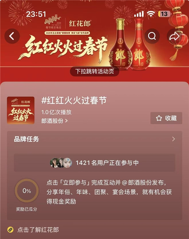 为让更多消费者参与这场新春盛宴,红花郎在抖音平台同步上线“红红火火过春节”话题视频征集活动,投入总价值100万元的奖品池,邀请用户分享家乡年俗、团圆聚餐、宴会欢庆等幸福瞬间。